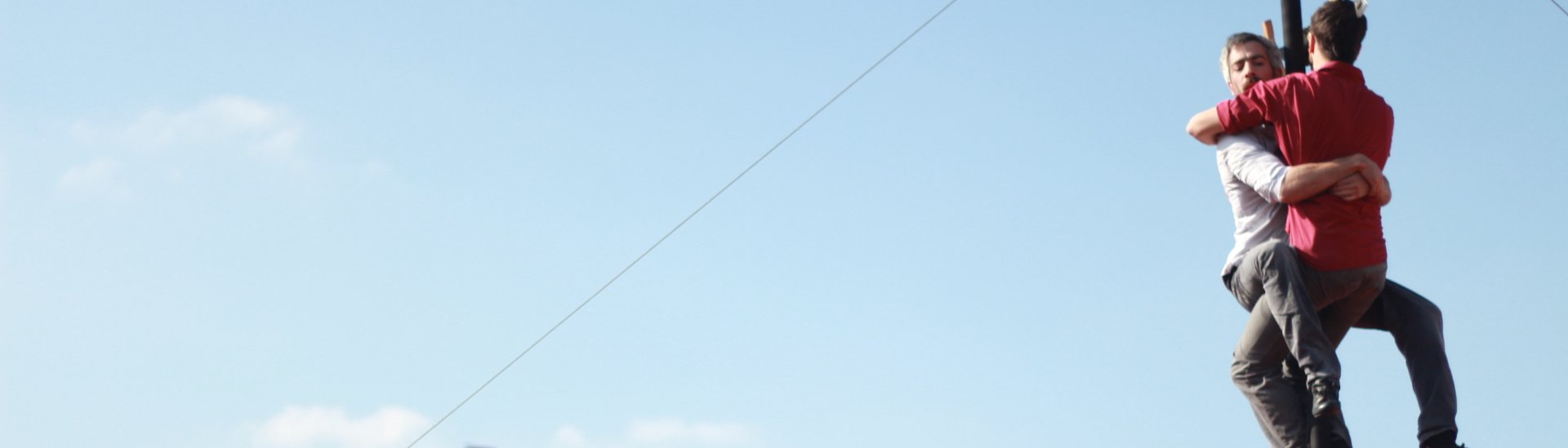 Deux amis, deux frères,… deux hommes occupent leur espace. Ils sont chez eux, ils sont dans un jardin, un parc, un terrain vague, une forêt. Ils flânent et s’occupent posément. Puis naît le plaisir de jouer et de se mettre au défi. Des morceaux de pommes volent dans les airs pour arriver dans la bouche d’un guitariste Funky aux notes rebelles. L’enthousiasme et un souffle créatif poussent les défis crescendo, et les haches entrent en scène. Elles tournent et sont manipulées en équilibres instables au tempo d’un beat box-harmonica tumultueux. Poussant la malice et allant toujours plus loin dans leur délire, l’un d’eux se transforme une cible. Les haches volent alors, et s’abattent dans un ballet délirant, aérien et vertigineux.