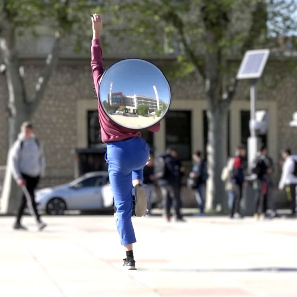 Une place urbaine. Un public convoqué et/ou passant. Un corps qui danse de dos avec un rétroviseur de rue qui masque sa tête. Les spectatrices et spectateurs voient le rétroviseur et le corps. La danseuse ne voit pas le public. Elle ne maîtrise pas l’image reflétée. Son intention première est de se mettre en mouvement en cherchant à montrer ce qu’elle ne voit pas. L’espace interagit avec les lignes du corps et inversement.