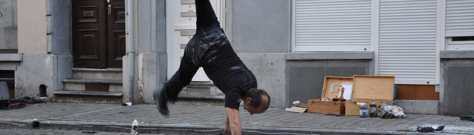 Avec une danse physique et engagée, Jean-Antoine Bigot prend à bras le corps le tableau et les éléments du décor. Le tableau devient alors une toile en mouvement, manipulée, transportée, déplacée par le peintre/danseur. Cette alternance de traits et de danse accompagnée à la guitare par Pascal Ferrari révèle la création d’une peinture.