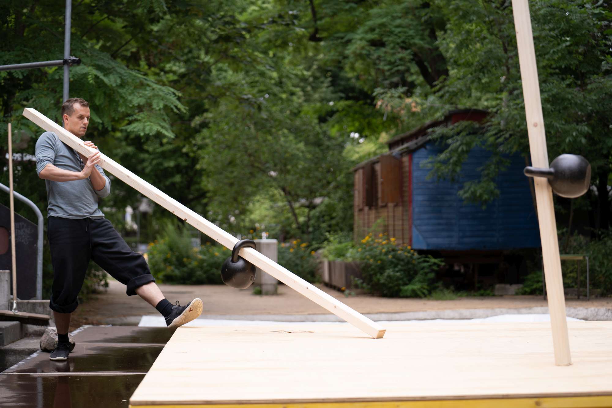 IM BAU est un mélange d’installation, de performance et d’action participative, conçu pour les espaces publics. Dans l’esprit d’un chantier de construction, le projet fonctionne comme une exposition axée sur le processus de (re)montage d’une sculpture composée de poutres en bois et d’haltères en fer.