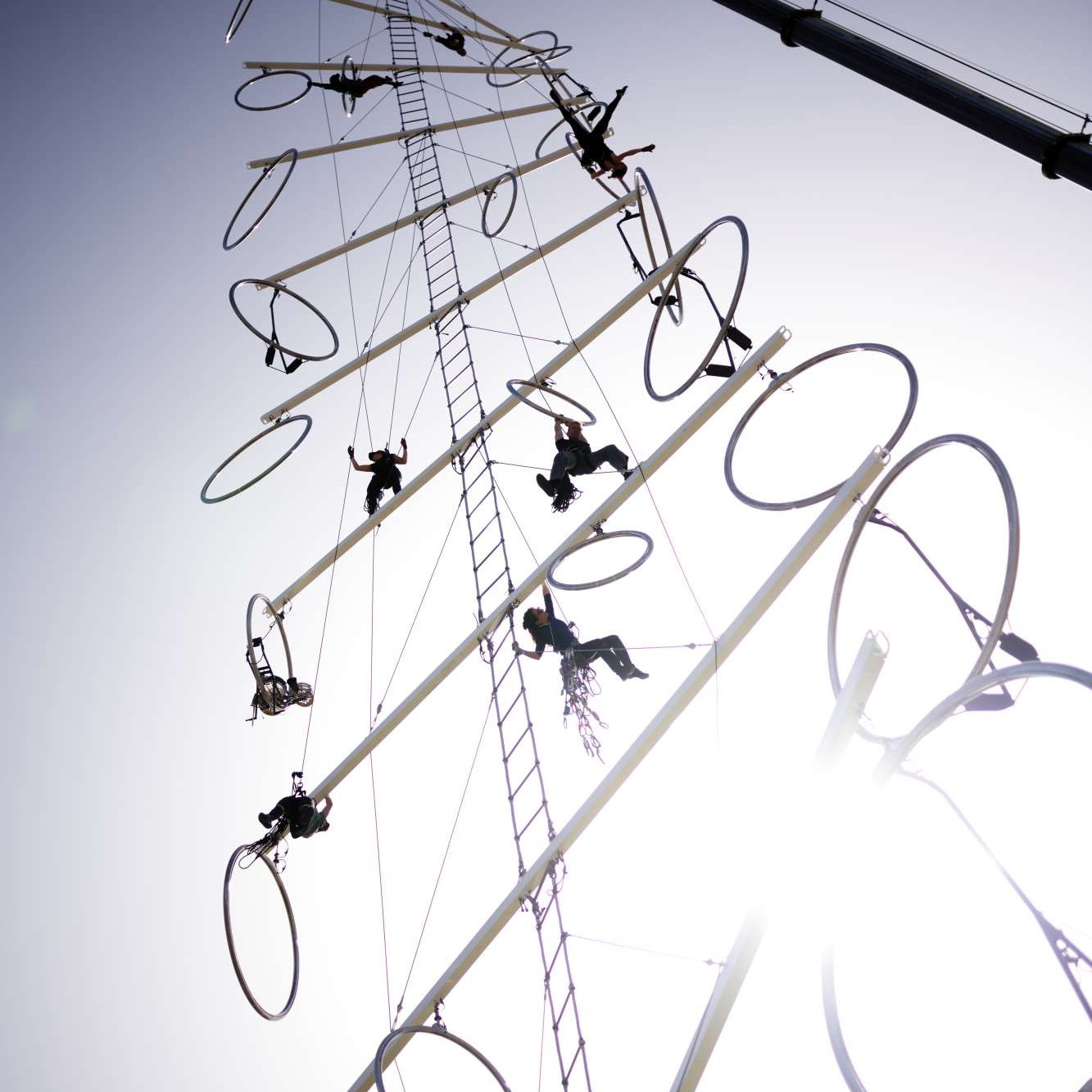 Les prouesses de la grimpe, la danse aérienne et la performance circassienne s’unissent dans une chorégraphie verticale portées par une musique originale Opéra / Techno / Hip-hop. Chants et percussions joués en Live revisitent différentes influences traditionnelles et sont sublimés par une composition de musique électronique aux sons résolument actuels.
